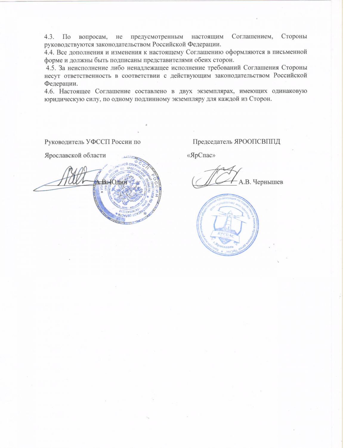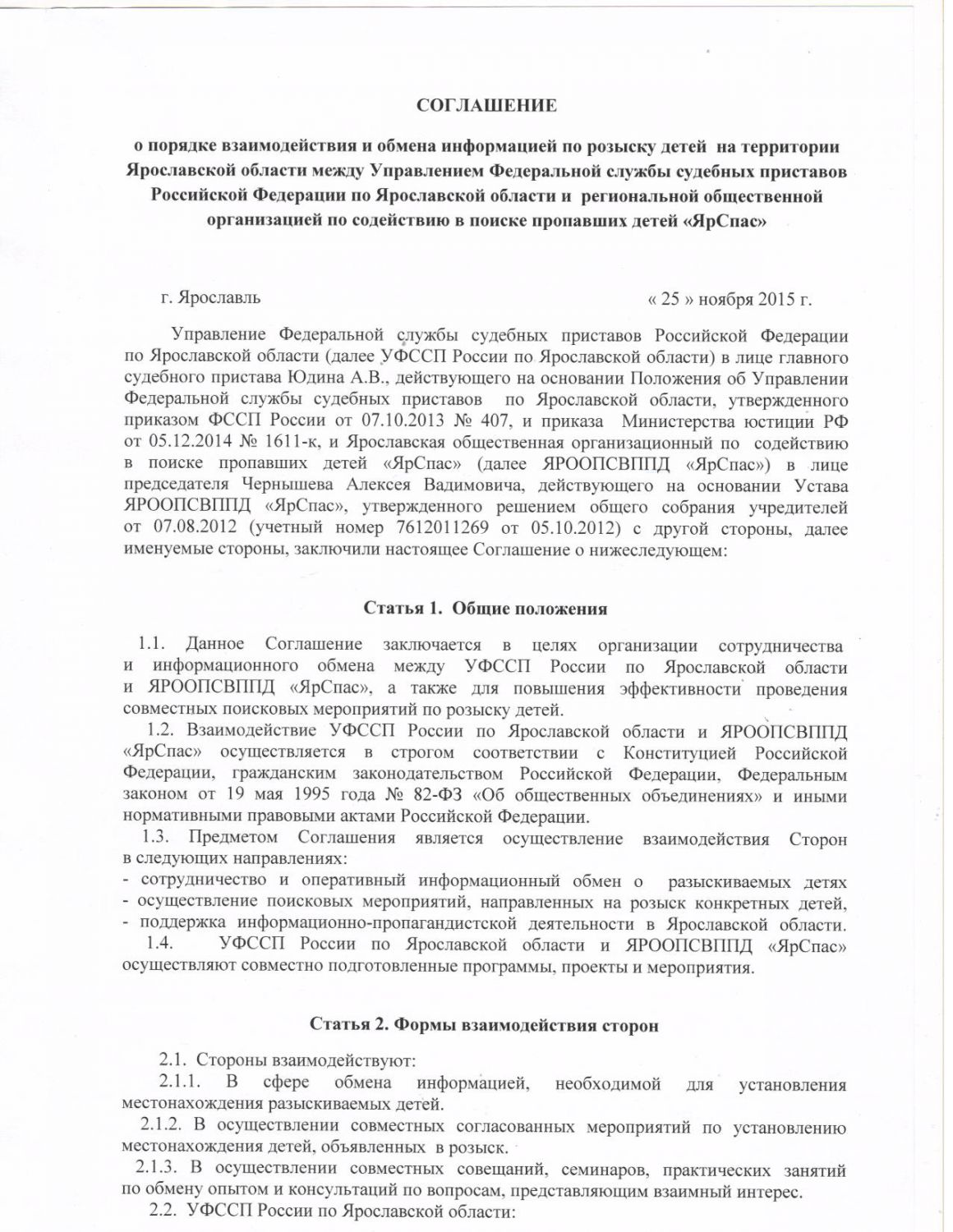 26.11.2015 года между ЯРОО "ЯрСпас" и УФССП по Ярославской области было заключено официальное соглашение о взаимодействии.