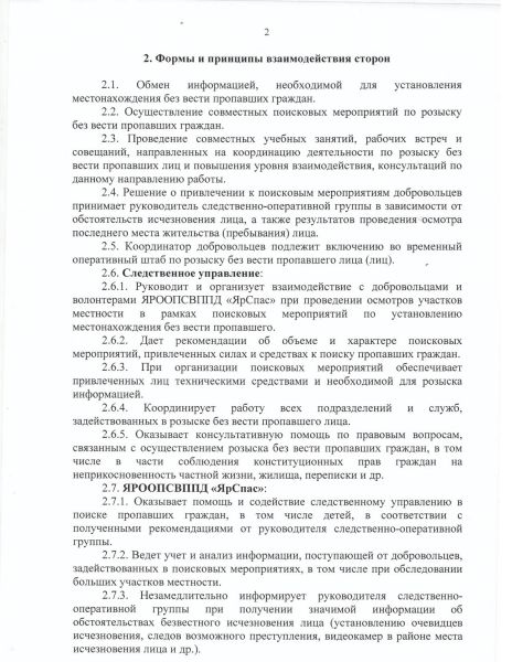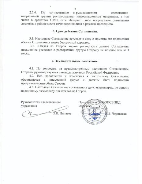 В конце сентября 2013 года было подписано Соглашение о порядке взаимодействия и обмена информации в случае безвестного исчезновения на территории Ярославской области человека между следственным управлением СК России по Ярославской области и ЯРООПСВППД "ЯрСпас"