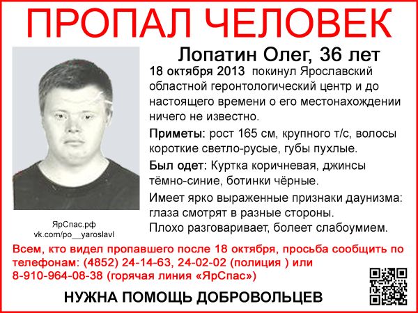 18 октября 2013 самовольно покинул Ярославский областной геронтологический центр и до настоящего времени о его местонахождении ничего не известно.