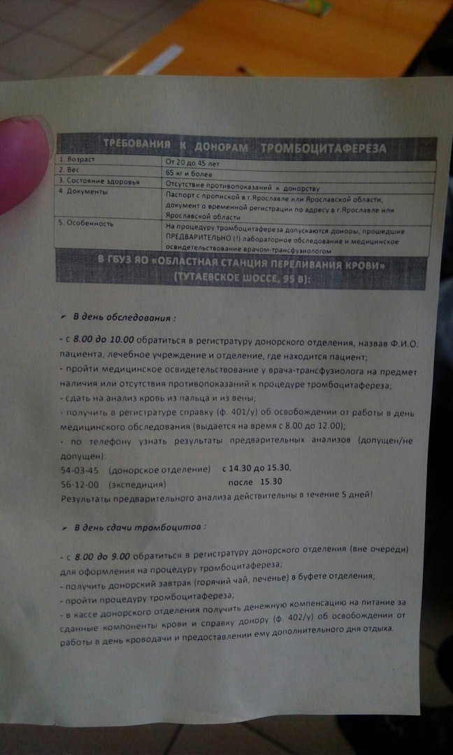 Размещаю по просьбе Ани Концевой, координатора ВПСО "Ты не один", г. Череповец. "Друзья, очень нужна Ваша помощь, у кого есть знакомые, доноры в Ярославле до 45 лет, которые готовы сдать кровь на тромбоциты (группа 3+) для близкого и родного мне человека!!!!!!! Сдать нужно для Беляевой Елены Игоревны Ярославская областная больница, отделение гематологии. Сдача крови с 20.06.16г. РЕПОСТ!!!!!!" Отсюда: https://vk.com/id11329948?_parent_post=12240938_2856&w=wall11329948_4667