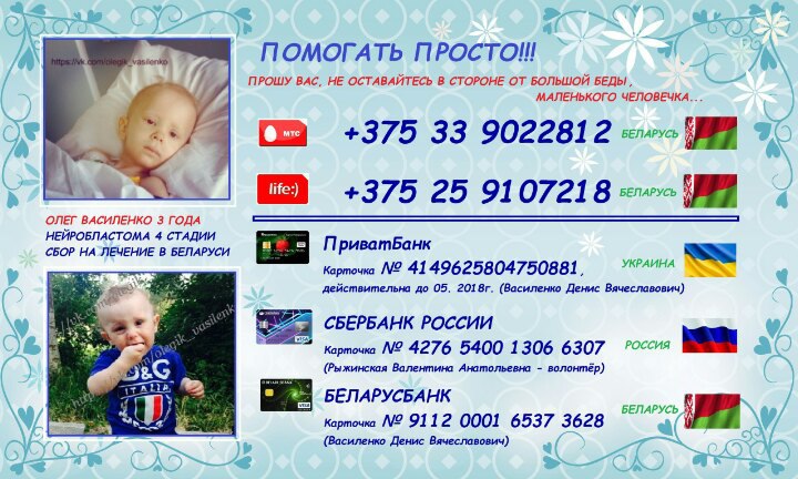 Вчера поступило в сообщения группы: Здравствуйте, меня зовут Патимат! 6 февраля 2014 в нашей семье родился замечательный малыш! Мы очень ждали мальчика, и были очень счастливы. Но через две недели после рождения нас положили в ОПН ДРКБ с омфалитом. С тех пор жизнь Шамиля - это постоянная борьба за выживание: поликлиники, больницы, бесконечные анализы, УЗИ и лечение. В 1.2г нам поставили диагноз ЗПР. Ходить наш сыночек начал в 2.2г. Малыш угасал с каждым днем, и никто не мог из врачей нам сказать что же происходит с нашим малышом. В сентябре 2016 г в НИИ им. Н. И. Пирогова в г. Москва был установлен диагноз: мраморная болезнь. Дальнейшие прогнозы врачей неутешительны. Он может потерять зрение, слух, может развиться гидроцефалия. Мне стало очень страшно за него!!!! Я так боюсь его потерять! Тут же начала искать любую информацию про этот диагноз. Оказалось, что единственный шанс сохранить жизнь Шамилю- это трансплантация костного мозга (ТКМ), которую успешно проводят уже много лет в Израиле в клинике Хадасса. Благодаря вам, добрые сердца, нам удалось съездить на обследование в эту клинику. Доктор Полина подтвердила диагноз. Нам выставлен счет на ТКМ, которая необходима для нашего сыночка. Но сумма просто огромная! Нам никогда не найти самим такие средства... Мы очень хотим, чтоб наш сынок жил! Мир не без добрых людей! Очень просим спасти жизнь нашему Шамилю! Не проходите мимо! Просим всех неравнодушных людей ПОМОГИТЕ СПАСТИ СЫНА!!! группа помощи - https://vk.com/shamil_osteopetroz_sos Ссылка на документы - https://vk.com/album-132153891_239570... Ссылка на историю - https://vk.com/topic-132153891_345270... Ссылка на реквизиты - https://vk.com/topic-132153891_345260... РЕКВИЗИТЫ ДЛЯ ПОМОЩИ: Сб 4276 6000 3557 3712 На Магомедову Патимат М Билайн 89674026604 89674026506 МТС 89898980041 Мегафон 89289890705 89289890706 Киви 8 967 392 68 58 Яндекс 4100 1466 7979 549 PayPal: eim116@mail.ru