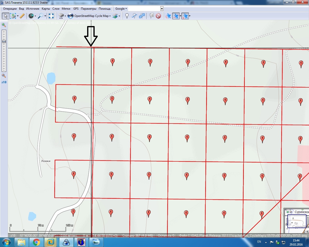 Нанес сетку в SAS с картами OSM. Стрелкой отмечена точка, координаты которой были вбиты в Грид как начальные. На самом изображении видно, что получилось: сетка смещена западнее на 100 м.
