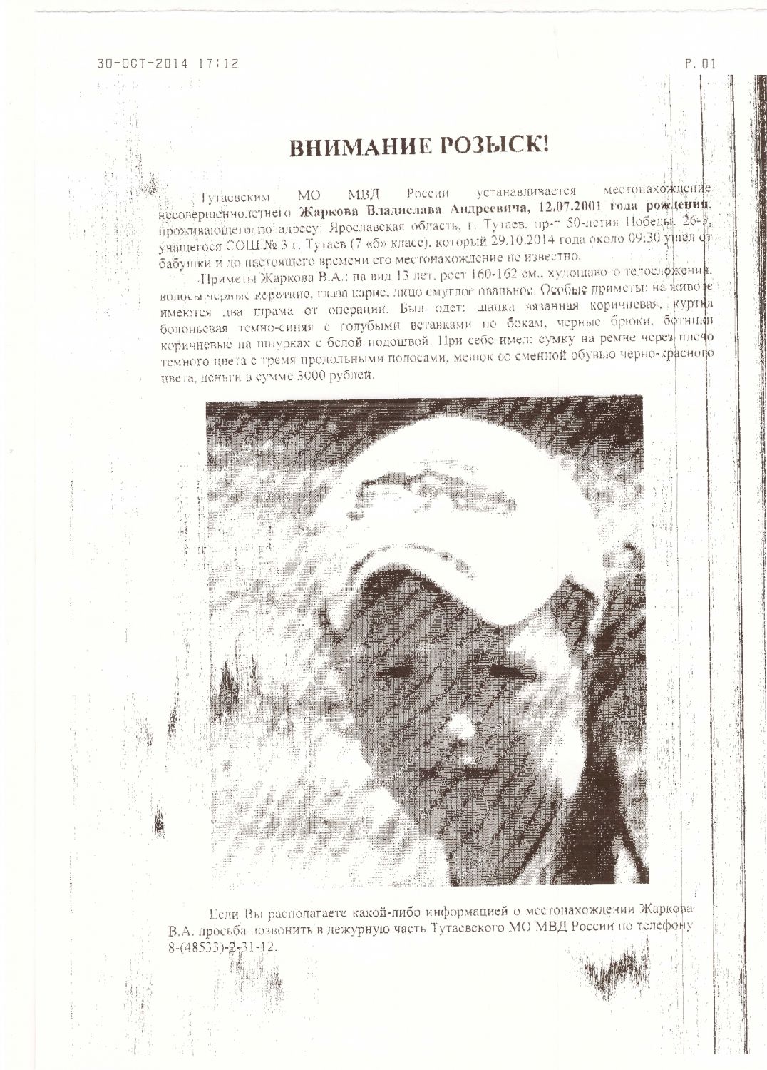 29.10.14. около 9-30 вышел из дома в г. Тутаев Ярославской области в школу и с тех пор о его местонахождении ничего не известно.