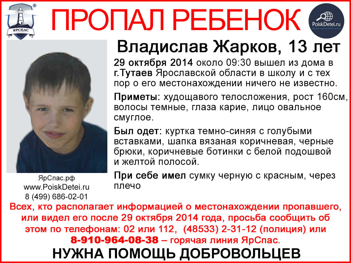 Всех, кто знает о местонахождении Владислава или видел его после 29.10.14. просим сообщить по телефонам: (48533) 2-31-12 (полиция), 8-910-964-08-38 (Горячая линия ЯрСпас)