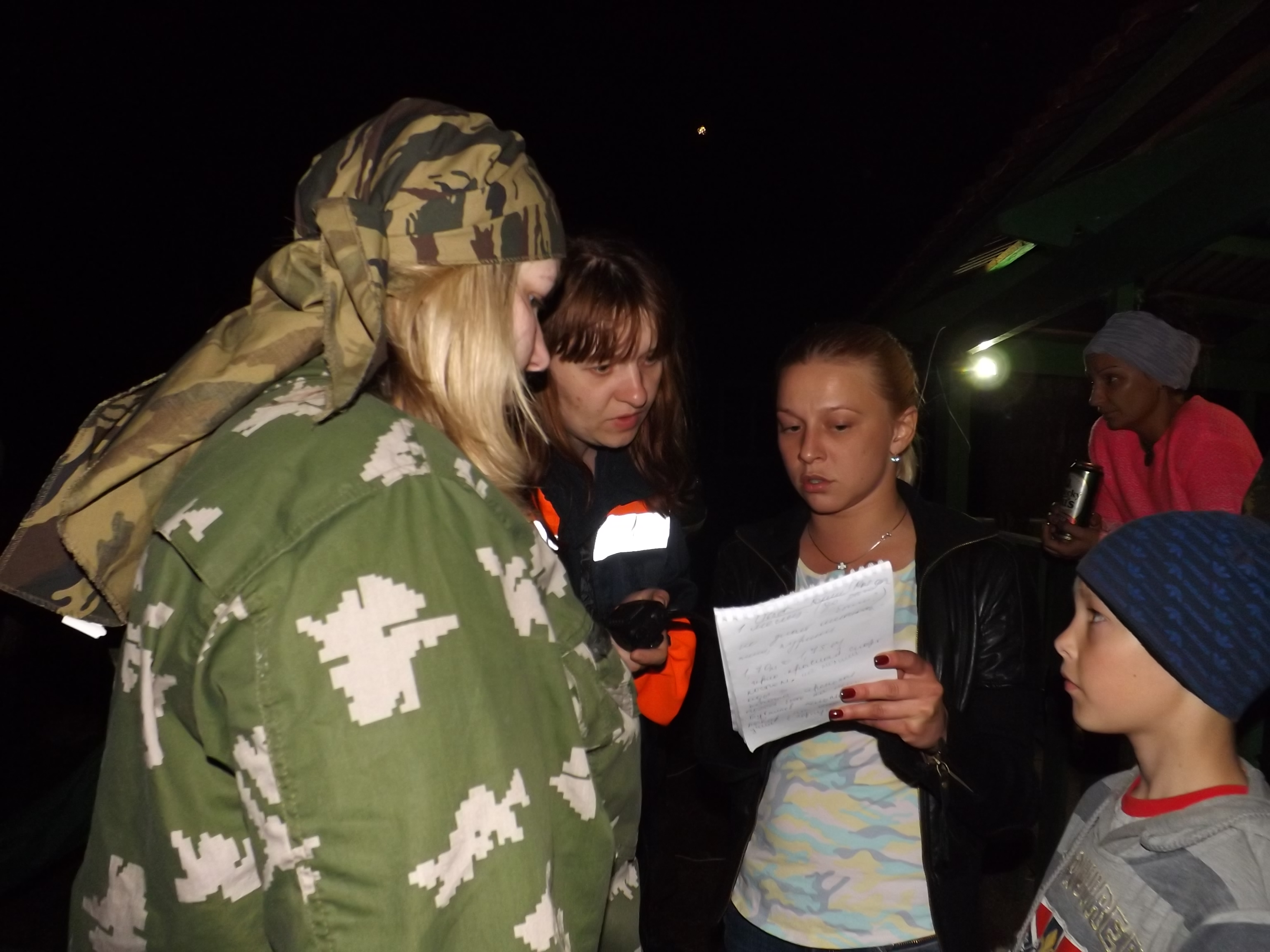 Я делаю большие глаза, хлопаю ресницами и задаю робкий вопрос: «Ребята, а вы детей ищете? У меня, кажется, подросток пропал…» Воцаряется тишина, потом кто-то кивает, кто-то, уже сообразив, что таки началось, тихо командует в рацию отряду подойти к беседке, а один из координаторов тверской «Совы» — Дима — подходит ко мне и начинает опрос. К нему подскакивает наша Ольга Макарова уже с блокнотом и ручкой и записывает ответы. Мысленно ставлю плюс за оперативность. Дима задает вопросы так, что у меня не остается никакой возможности юлить, — предельно конкретно, при этом умудряется давать указания волонтерам, что и кто должен делать. Одними губами шепчу ему: «Отлично. Респект!» Но – инструкторы не дремлют. Как только становится понятно, что Дима справится с координацией, его выводят из игры «укусом гадюки». (Позже выяснилось, что Дима – профессиональный спасатель. Про таких говорят «учить – только портить»). Координацию подхватывает снова представитель «Совы» — Паша. В штабе царит суета, очень много людей. Меня опрашивает Ольга, я, на секунду выпав из роли дуры-воспитательницы, спрашиваю, кто инфорг поиска, Ольга пожимает плечами. Чуть позже соображаю, что инфорг тверская Аня, наблюдаю, как она опрашивает Хаммера, который ей хамит. Про повара, конечно, все забыли. Эта информация была у Димы, но Дима «укушен» гадюкой и что нужно опросить еще одного свидетеля никто не помнит, конечно. А ключик-то именно у повара – конкретное направление, в котором ушел пропавший. Беру грех на душу и подыгрываю ребятам, шепнув Ольге, что они о ком-то забыли. Ольга быстро соображает и уносится с докладом к Ане. В этот же момент Хаммер, по указке инструкторов, «вспоминает», что у местных был обрез, а я, что пропавший всегда носил с собой нож, боясь нападения. И – почти сразу же – группа, ушедшая на периметр, находит «убитого» Максима. Без всякой информации от повара…